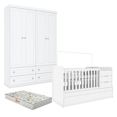 Berço Multifuncional Cleo e Guarda Roupa Infantil 4 Portas Mississipi Branco Fosco com Colchão Gazin - Henn