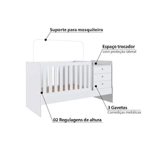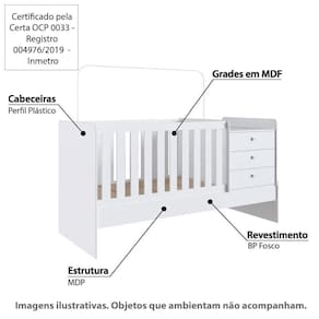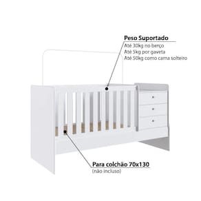 Características - Branco - Estrutura: MDP - Grades nas laterais em MDF - Revestimento: BP Fosco - Berço com Cômoda acoplada - 3 Gavetas - Corrediças metálicas - Puxadores em PVC - Colchão de 130x70cm para o berço (não incluso. Vendido separadamente) - Pode ser montada como Cama Solteiro - Colchão de 188x78 cm para cama solteiro (não incluso. Vendido separadamente) - Peso suportado: 30 kg como berço / 50 kg como cama solteiro / 5 kg por gaveta / 10 kg na prateleira - Certificado pela Certa OCP 0033 - Registro 004976/2019 - Inmetro - Marca Completa Móveis - Garantia de 3 meses para defeito de fabricação.