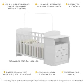 Este modelo ainda vem com armação para mosquiteiro para deixar qualquer ameaça longe do seu pequeno e grade fixa protegendo o de qualquer risco de acidentes. Todo o berço ainda conta com estrutura arredondada para melhor segurança do seu bebê.