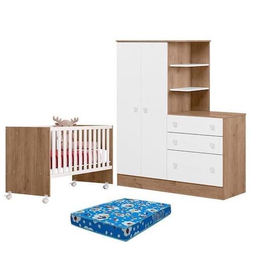 Berço Nacional 3540 e Guarda Roupa com Cômoda 4070 Doce Sonho Carvalho Rústico TOQ Branco e Colchão Ortobom – Qmovi