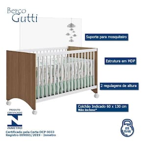 Decore o cantinho do bebê com um móvel que irá garantir conforto e noites tranquilas! Apresentamos o Berço Nacional Gutti, desenvolvido pela Móveis Estrela. Acompanha suporte para mosquiteiro, possui 2 regulagens de altura e suporta até 25kg. Ainda conta com um design minimalista e moderno, Kit Rodízio, acabamento em pintura uv e estrutura em MDP resistente e de alta durabilidade, garantindo a utilização por muito mais tempo. Confira mais detalhes abaixo, compre com a gente e receba no conforto de sua casa!