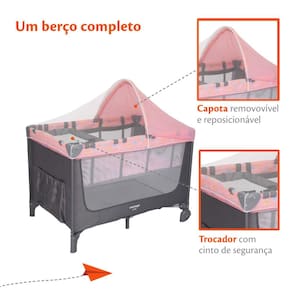 Super completo e portátil com trocador e capota removíveis, prático para o dia a dia dos pais, também pode ser utilizado como cercado. Colchonete macio e mosquiteiro elevado.