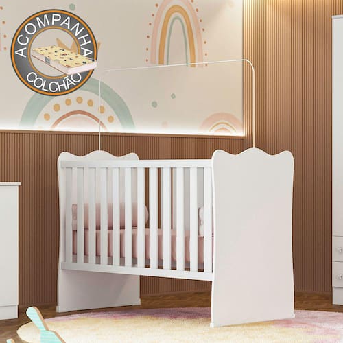 Características Estrutura em MDP Acabamento em pintura UV Atóxica Grades de proteção fixas feitas em MDF Estrado em MDF com 3 opções de altura Acompanha suporte para mosquiteiro Acabamento das bordas em perfil PVC ACOMPANHA COLCHÃO 130 X 60 Suporta até 40 kg.