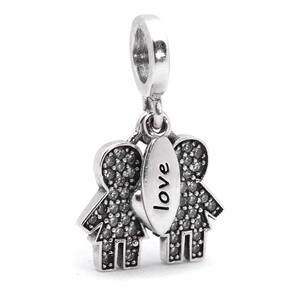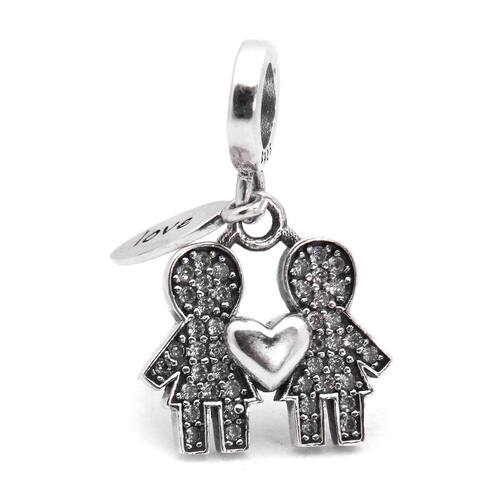 Represente o meu amor na sua coleção. Esse berloque estilo pingente em fomato de casal é um graça. O Coração entre eles torna a peça mais romântica assim como a plaquinha escrito love. As pedras de Zircônias preenchem a frente da peça deixando-a fácil de combinar com outros berloques. Ficará lindo entre dois berloques separadores em formato de coração. Berloque fabricado em Prata 925 e Zircônias. Não se engane com materiais folhados e banhados. acabamento e polimento manuais. Material: Prata 925 e Zircônia. Cor: Prata. Medidas aproximadas: 20mm altura x 15mm largura Compatível com todas as pulseiras. Marca: Mundo Briller Ean: 7893651942712