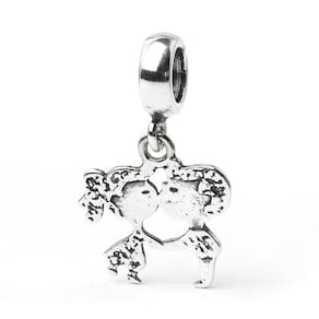 Aquele beijo especial representado em um berloque. Berloque estilo pendente no formato de um casal se beijando, fabricado em Prata 925. Não se engane com materiais folheados e banhados. Acabamento e polimento manuais. Material: Prata 925. Cor: Prata. Medidas aproximadas: 20mm de altura x 12mm de largura. Compatível com todas as pulseiras. Marca: Mundo Briller Ean: 7893651940169