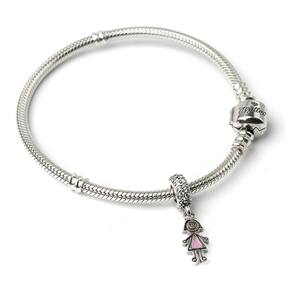 Como um desenho infantil, essa menininha sorri docemente com o seu vestidinho rosa. O passador com diversas Zirconias deixam a peça mais encantadora. Represente aquela criança especial na sua coleção. Berloque estilo pendente é fabricado em Prata 925 e esmalte. Não se engane com materiais folheados e banhados. Acabamento e polimento manuais. Material: Prata 925 e esmalte. Cor: Prata, rosa e preto. Medidas aproximadas: 25mm de altura x 3mm de largura. Compatível com todas as pulseiras. Marca: Não Informado