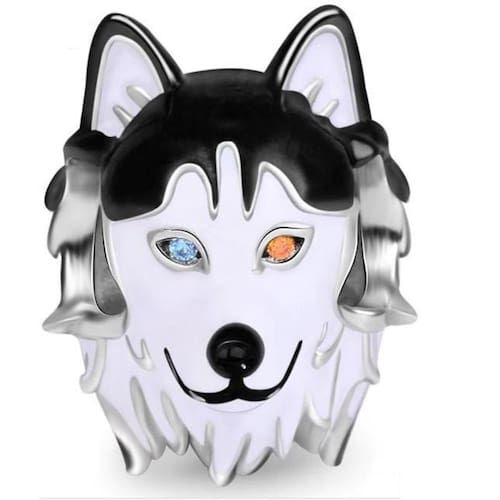 Olha que imponente Os olhos, um de cada cor, marcam bem esta raça, peça esmaltada em branco e preto, traz muita realidade para esta peça. Berloque estilo separador fabricado em Prata 925. Não se engane com materiais folheados e banhados. Acabamento e polimento manuais. Material: Prata 925 e esmalte. Cor: Prata, branco, azul, castanho e preto. Medidas aproximadas: Compatível com todas as pulseiras. Marca: Mundo Briller