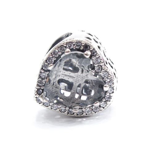 Berloque estilo separador com um coração de zircônia transparente parte central e zircônias no contorno. Não se engane com materiais folheados e banhados. Acabamento e polimento manuais.