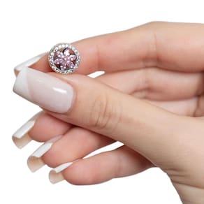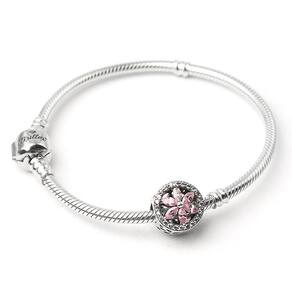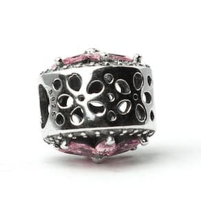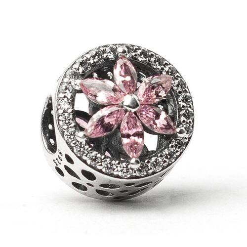 Berloque estilo pavê, ideal para usar como separador, com uma grande flor rosa formada com pedras, cravejado de zircônias. Não se engane com materiais folheados e banhados. Acabamento e polimento manuais.