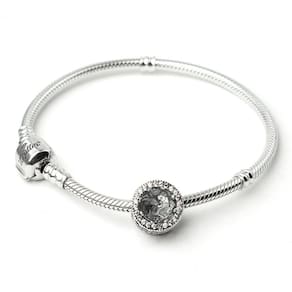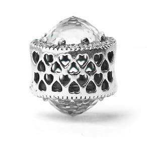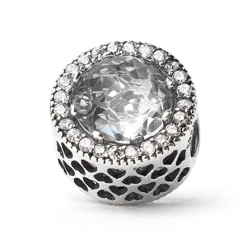 Duas pedras brilhantes facetadas adornam cada lado deste berloque estilo separador. Elas são emolduradas por uma fileira de pedras claras e cintilantes. Um belo padrão de corações recortados preenchem a volta da peça.Berloque formato separador com pedras de Zircônia transparante. Material: Prata e Zircônia. Cor: Prata. Medida aproximada: 11mm de diâmetro. Compatível com todas as pulseiras. Marca: Mundo Briller Ean: 7899057813441