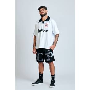 Apresenta estampas aplicadas em técnica de transfer e silkscreen, com etiqueta lateral e TAGs personalizadas da Collab Approve x Corinthians, reforçando o estilo exclusivo e o orgulho de vestir o manto alvinegro fora dos gramados.