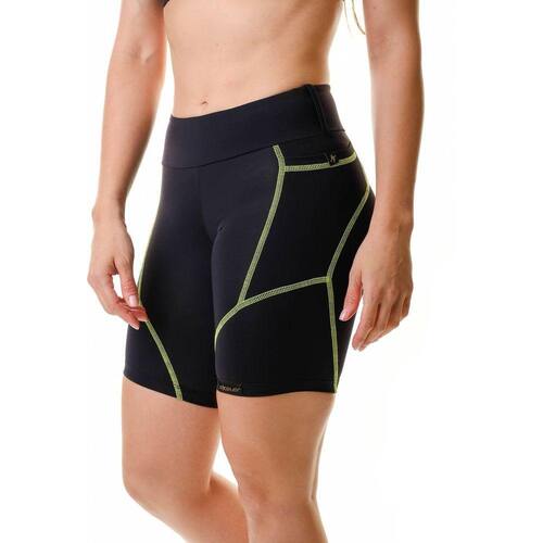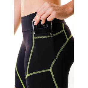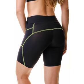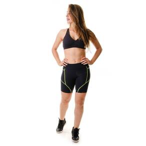 Bermuda de compressão preta feminina com 2 bolsos laterais, trançado na cor neon e passantes na cintura para cinto de hidratação. Desenvolvida para corrida de rua, maratona, trail running, corrida de montanha.
