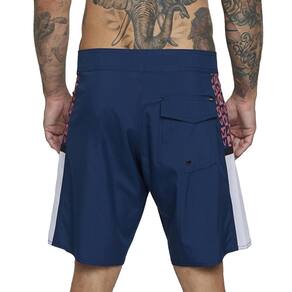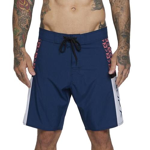 Bermuda Rvca com alta elasticidade, comprimento de 18 polegadas, fechamento em cordão de ajuste externo, recortes laterais com estampa sublimada logotipia, bolso traseiro com lapela fechamento em fitas duplas aderentes e estampa logo na lateral da perna.