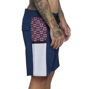 Bermuda Rvca com alta elasticidade, comprimento de 18 polegadas, fechamento em cordão de ajuste externo, recortes laterais com estampa sublimada logotipia, bolso traseiro com lapela fechamento em fitas duplas aderentes e estampa logo na lateral da perna.