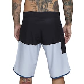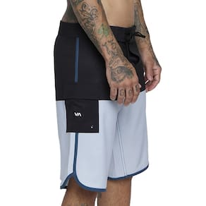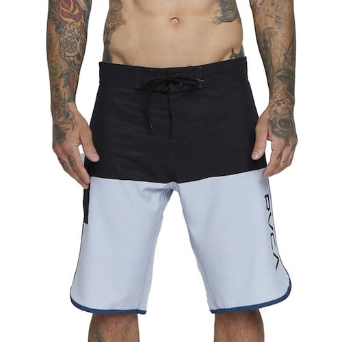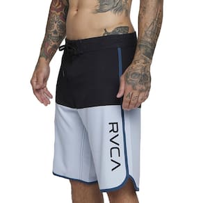 Bermuda Rvca com alta elasticidade, comprimento de 19 polegadas, fechamento em cordão de ajuste externo, laterais e barras com viés aplicado, bolso lateral com patch bordado, lapela e fechamento em fitas duplas aderentes e estampa logo na lateral da perna.
