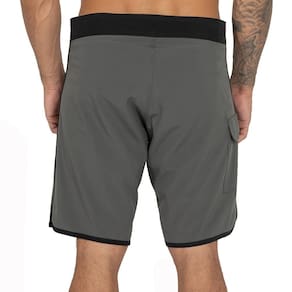 Bermuda Rvca com fechamento em cordão de ajuste externo, 18", laterais e barras com viés aplicado na cor do cós, bolso lateral com patch bordado, lapela e fechamento com tiras duplas aderentes e estampa logo na lateral da perna.