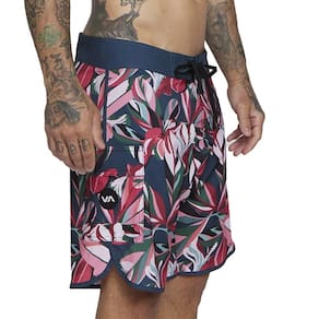 Bermuda Rvca com alta elasticidade, comprimento de 18 polegadas, fechamento em cordão de ajuste externo, laterais e barras com viés aplicado, bolso lateral com patch bordado, lapela e fechamento em fitas duplas aderentes e estampa logo na lateral da perna.