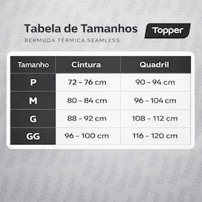 - Marca: Topper - Composição: 95% Poliamida/ 4% Elastano/ 1% Polipropileno - Modelo: Bermuda Térmica Masculina - Gênero: Masculino - Modelagem: Ajustada / Compressão - Comprimento: Acima do joelho - Indicação: Treino, ciclismo, corrida, futebol, academia e atividades esportivas - Costura: Sem Costura ( seamless ) - Painéis de Mesh: Seleção de pontos que auxilia na respirabilidade - Cós: Com elástico reforçado