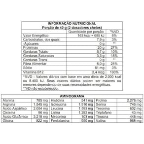 Ingredientes: Fórmula Best Vegan Blend (Proteína Isolada da Ervilha, proteína concentrada do arroz, proteína concentrada da semente de abóbora, proteína da chia), polpa de maçã em pó, leite de coco em pó, coco ralado, quinoa em pó e amaranto em pó, cloreto de sódio, vitamina B12 (metilcobalamina), espessante goma acácia, aromatizante idêntico ao natural e edulcorante natural Reb A (glicosídeos de esteviol). "NÃO CONTÉM GLÚTEN".