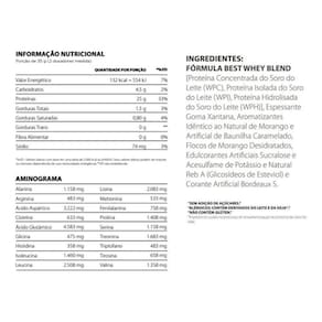 O Best Whey é um suplemento alimentar super proteico que foi pensado nos atletas de ponta e nos praticantes de atividades físicas que desejam uma melhore manutenção , construção e recuperação muscular, a formulação do Best Whey junta de forma sinérgica os 3 tipos de proteínas mais consumidas no mundo pelos atletas que é o whey concentrado, whey isolado e whey hidrolisado, por conta dessa formulação cada dosagem do Best Whey fornece 25g de proteína do soro do leite de alto valor biológico e com uma boa carga de aminoácidos fazendo com que assim o Best Whey garanta o melhor auxilio para você obter a tão sonhada evolução muscular.