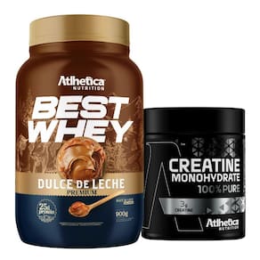 Best Whey - Atlhetica Nutrition Best Whey é um suplemento de proteínas 3W da Atlhetica Nutrition, disponível em diversos sabores deliciosos. Com uma combinação de proteínas hidrolisada, concentrada e isolada do soro do leite, cada porção fornece 25g de proteína de alta qualidade. Benefícios: Baixo teor de açúcar; Sem glúten; Benefícios ao apetite; Auxilia no pré e pós-treino; Baixo teor de carboidratos; 25g de proteína por porção; Sugestão de Consumo: Misture 35g 2 dosadores em 200ml de água ou bebida gelada de sua preferência. Creatina 100% Pure - Atlhetica Nutrition A Creatina 100% Pure da Atlhetica Nutrition é um suplemento de alta pureza, desenvolvido para proporcionar máxima absorção e aproveitamento. Ideal para atletas e praticantes de atividades físicas que buscam força, energia e benefícios pós-treino, sendo amplamente reconhecida por sua eficácia e custo-benefício. Benefícios: Disposição e desempenho; Auxílio no pós-treino; Grau extremo de pureza; Ótimo custo-benefício; Rendimento a longo prazo; Qualidade Atlhetica Nutrition; Sugestão de Uso: Dose diária: 3g 1 dosador raso uma vez ao dia, misture 3g de creatina em 200ml de água e consuma imediatamente após o preparo. Marca: Não Informado Ean: 7794639580363