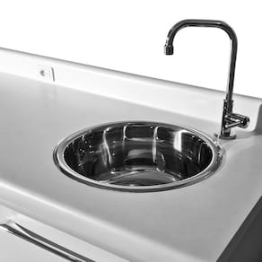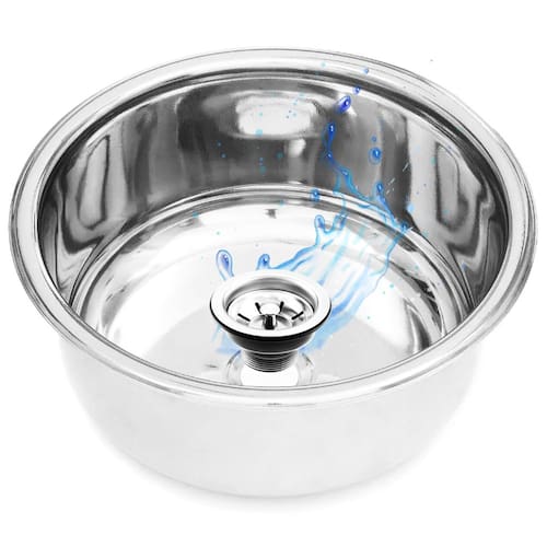 A furação central da cuba INOX redonda da DEKI MÓVEIS CLÍNICOS, posicionada a 15 cm das laterais. Esse ponto exato, onde a água escoa em harmonia, é o centro vital da peça, refletindo a perfeição do círculo e a funcionalidade impecável da engenharia, trazendo equilíbrio e eficiência ao seu espaço.