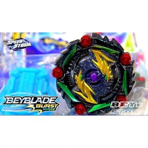 Inclui 1 lançador Beyblade Burst Speedstorm e 1 top de batalha competitivo de giro à direita: Curse Satomb S6 D71 TSP06-M.A parte superior inclui metal na ponta de desempenho, perímetro de absorção de choque e componente Storm Chip de rotação direita.