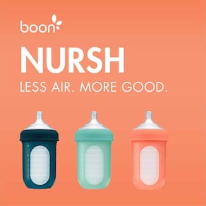 PRODUTO INTERNACIONAL. Conheça a Inovação Boon NURSH! Com essa mamadeira, você tem a melhor experiência alimentar desde os mamilos! A bolsa de silicone é super prática e também é reutilizável, colaborando com a redução de ingestão de ar, diminuindo a chance de gases e cólicas
