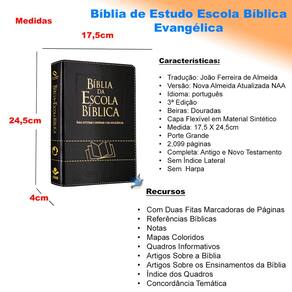 Bíblia de Estudo da Escola Bíblica. Tradução de João Ferreira de Almeida, versão Nova Almeida Atualizada NAA. Capa Luxo Flexível, feita em material sintético, cor Preto. Com letra Padrão, e possui duas fitas marcadoras de páginas. Esta Bíblia é Inovadora e indispensável, indicada para leitores de diferentes perfis como: professores e alunos da escola bíblica; líderes de pequenos grupos e cristãos que desejam iniciar ou aprofundar o estudo das Escrituras.