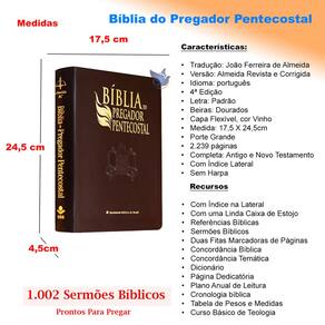 A Bíblia do Pregador Pentecostal é única Bíblia com sermões prontos junto ao texto bíblico, além de curso básico de Teologia. Seu principal objetivo é colocar à disposição de todos os obreiros uma ferramenta prática e de conteúdo rico para o exercício do ministério cristão. São 1.002 sermões bíblicos, que servirão de auxílio e orientação para pregações voltadas aos mais diversos públicos e ocasiões. Especialmente elaborados pelo teólogo e pastor Erivaldo de Jesus, os sermões abordam cada um dos 66 livros da Bíblia, além de tratarem de temas para ministrar a Palavra de Deus em convenções de pastores, reuniões de obreiros, escolas bíblicas, reuniões para mulheres e festividades em geral da Igreja. Cada sermão é subdividido em variados tópicos e referências bíblicas acerca do tema abordado e possui os três elementos fundamentais do princípio da homilética, que é a arte de pregar: introdução, explanação e conclusão. A publicação oferece, ainda, um curso básico de Teologia, composto de 12 matérias teológicas, que dará uma pequena noção do que é Teologia e sua importância para o crescimento espiritual, intelectual e bíblico de todos os estudantes da Bíblia Sagrada. Numa sociedade em que as pessoas vivem sempre correndo e com o tempo cada vez mais escasso para realizar todas as tarefas que têm de desempenhar, esta edição da Bíblia Sagrada tem o objetivo de facilitar a vida de pastores e pregadores, oferecendo um caminho, uma luz, para que desenvolvam os temas que desejam trabalhar em seus sermões, de uma forma prática e rápida.