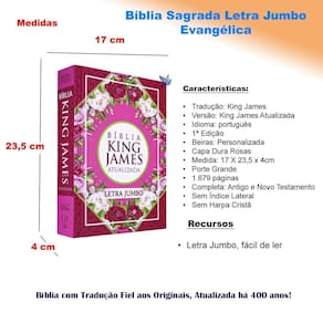 Bíblia Sagrada traduzida por King James, versão King James Atualizada. Capa Dura Rosas. Porte grande, possui 1679 páginas. Como recurso letra Jumbo, que facilita a leitura. Bíblia Completa com Antigo e Novo Testamento.