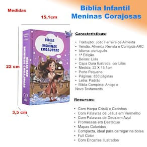 Bíblia Sagrada Infantil das Meninas Corajosas. Na tradução de João Ferreira de Almeida, versão ARC Almeida Revista e Corrigida. Com Capa Dura Ilustrada,cor Lilás. Acompanha Harpa Cristã e Corinhos. Palavras de Jesus em Vermelho e Palavras de Deus em Azul. Porte Médio. Bíblia Completa: Antigo e Novo Testamento.