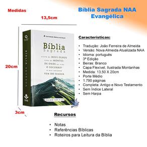 Tradução: João Ferreira de Almeida Versão: naa Nova Almeida Atualizada Idioma: português Beiras: Branco Capa Brochura, Ilustrada Montanhas Letra Gigante Medidas: 13,50 x 20cm 1.790 páginas Porte Médio 3 Edição