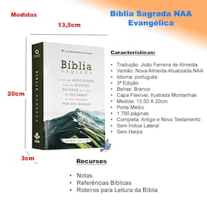 Essa edição da Bíblia Sagrada é ideal para quem deseja ler a Palavra de Deus diariamente e procura um texto clássico, mas com linguagem atual. A Nova Almeida Atualizada NAA é uma tradução lançada em 2017 pela SBB, resultado de uma profunda revisão da consagrada tradução Almeida Revista e Atualizada. Ela apresenta um texto clássico com uma linguagem atual, seguindo a norma padrão do português escrito e falado no Brasil. essa Bíblia é completa, com divisão de o Antigo e Novo Testamento, sendo o Antigo Testamento, o que conta a história do povo hebreu desde a criação do mundo até a conquista da terra prometida, e Novo Testamento, o que relata a vida e o ensinamento de Jesus Cristo, além do desenvolvimento da igreja cristã primitiva.