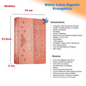 A Bíblia Sagrada baseada na tradução de João Ferreira de Almeida, versão Almeida Revista e Corrigida (ARC), que é considerada uma das mais tradicionais e confiáveis traduções da Bíblia em língua portuguesa. O diferencial dessa Bíblia Sagrada é que ela possui letra gigante, um tamanho de fonte ampliado, que torna a leitura mais fácil e confortável. Ideal para quem quer mergulhar na leitura da Palavra de Deus. Possui índice na lateral e fita marcadora de páginas, que ajuda a identificar onde o leitor parou de ler ou para destacar informações importantes. As fitas marcadoras são ferramentas úteis para quem precise de uma maneira fácil de encontrar informações. Como recursos possui: mapas; notas e referências bíblicas; tabela de pesos, moedas e medidas; leitura para dias especiais; como encontrar ajuda na Bíblia e o que a Bíblia diz sobre o perdão de Deus. Essa Bíblia é completa, com divisão de o Antigo e Novo Testamento, sendo o Antigo Testamento, o que conta a história do povo hebreu desde a criação do mundo até a conquista da terra prometida, e Novo Testamento, o que relata a vida e o ensinamento de Jesus Cristo, além do desenvolvimento da igreja cristã primitiva, as Palavras de Jesus estão destacadas em Vermelho, no Novo Testamento.