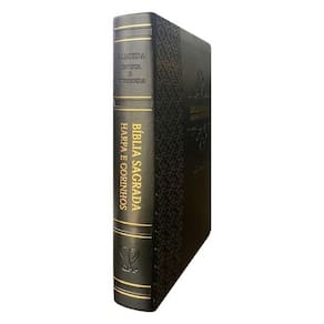 Tradução: joão ferreira de almeida Versão: almeida revista e corrigida arc Idioma: português Letra: jumbo Beiras: dourado Capa flexível em pu luxo, modelo arabesco, cor preta Medida: 23,8 x 15,2cm 1 edição 1.920 páginas + harpa Porte grande Completa: antigo e novo testamento Com harpa cristã Sem índice
