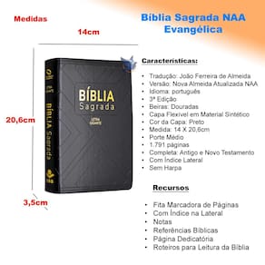 A Bíblia Sagrada na tradução de João Ferreira de Almeida, versão Nova Almeida Atualizada NAA. Com Capa Flexível em Material Sintético, cor Preta. Possui Índice na Latera e Fita Marcadora de Páginasl. Porte Médio, 1.791 páginas. Bíblia Completa: Antigo e Novo Testamento.