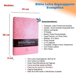 A Bíblia Sagrada traduzida por João Ferreira de Almeida, versão Nova Almeida Atualizada. Capa Flexível em Material Sintético, cor Rosa Claro. Porte Grande, 2.137 páginas. Como recursos possui: duas fitas marcadoras de páginas, índice na lateral, página dedicatória, notas e referências, entre outros. Edição Completa com Antigo e Novo Testamento, as Palavras de Jesus estão destacadas em Vermelho no Novo Testamento. Elegante e Moderna, esta Bíblia com letra Supergigante, oferece uma experiência de leitura mais dinâmica e agradável.