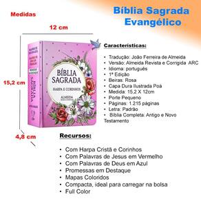 Tradução: João Ferreira de Almeida Versão: almeida Revista e Corrigida ARC Idioma: português Beiras: Rosa Capa Dura Ilustrada Poá, cor Full Color Letra Padrão Medidas: 15,2 x 12cm 1.215 páginas Porte Pequeno 1 Edição Com Harpa Cristã Sem Índice Lateral