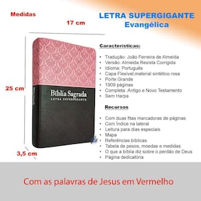 Bíblia Sagrada Supergigante ARC Índice Lateral Rosa Marrom B1416 Medidas 17x25x3,5cm, 1.920 páginas, Palavras de Jesus em Vermelho, com Índice Lateral, sem harpa.Bíblia Sagrada LETRA SUPERGIGANTE, Tradução João Ferreira de Almeida, Versão: Almeida Revista Corrigida ARC , Capa em Material Sintético na cor Rosa e Marrom. Ideal para quem deseja ler a Palavra de Deus diariamente. Com tamanho de letra Supergigante e palavras de Jesus impressas em vermelho, este modelo da Bíblia Sagrada oferece mais conforto na leitura, especialmente ao grupo da terceira idade ou àquelas pessoas com problemas leves de visão. Características: Tradução João Ferreira de AlmeidaVersão: Almeida Revista e CorrigidaIdioma: portuguêsBeiras douradasCapa flexível em Material sintéticoMedida: 17,0 X 25 cmPorte Grande1.920 páginasCom índice lateralCom 2 fitas marcadoras de páginasCompleta: Antigo e Novo TestamentoSem Harpa RecursosComo encontrar ajuda na BíbliaLeituras para dias especiaisMapas coloridosNotas e referência bíblicasO que a Bíblia diz sobre o perdão de DeusPalavras de Jesus impressas em VermelhoTabela de pesos, moedas e medias página dedicatóriaCondição: NovoFormato: Capa MaleávelEditora: CPPQuantidade inclusa: 1Cor: Rosa Marrom