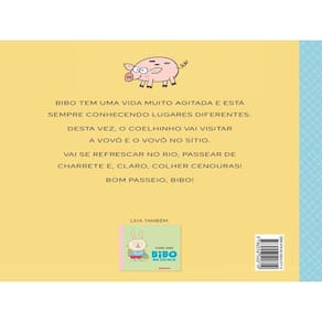 Da autora do best-seller Gildo , a coleção Bibo chega à Brinque-Book. Nesta nova edição do livro em capa dura, o adorável coelho vai também passear no pomar e se refrescar no rio do sítio da vovó e do vovô. Bibo vai visitar a vovó e o vovô no sítio. Lá ele encontra os porcos, o pato e o cavalo, dá milho às galinhas, passeia de charrete e só para quando começa a chover. Aí, é hora de comer um bolo bem gostoso e ficar só escutando o barulhinho da água caindo. A autora Silvana Rando criou a coleção Bibo pensando nas riquezas do dia a dia que esquecemos depois de grandes. O coelho, sua família e seus amigos vivem situações cotidianas com as quais todos os pequenos leitores vão se identificar de imediato e ainda despertam boas lembranças nos leitores nem tão pequenos assim. O texto curto e as ilustrações vivas e bem-humoradas de Silvana são um convite a repetidas leituras. Além de Bibo no sítio , conheça também o livro inédito Bibo na escola . Indicado para leitores a partir de 0 ano.