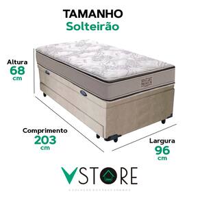 A tecnologia que a sua casa merece está na V-Store! A tecnologia e funcionalidade que sua casa merece estão aqui! O Conjunto Colchão Dallas e Bicama com Cama Auxiliar e Baú oferece conforto, praticidade e estilo. O colchão, com molas ensacadas, espuma D33, Euro Pillow e tecnologia EPS, proporciona excelente suporte, durabilidade e conforto térmico. A bicama, com cama auxiliar e baú espaçoso, otimiza o espaço do seu quarto, oferecendo suporte confortável para visitas e armazenamento extra para organizar o ambiente. Revestida com tecido sintético resistente, garante durabilidade e facilidade de manutenção. Característica Do Colchão: Modelo: Four SeasonMarca: V-StoreTamanho: SolteirãoDimensões: 96x30x203 (Largura x Altura x Comprimento)Conforto: MédioSistema: Molas EnsacadasPillow: Pillow TopPeso Máximo recomendado: 150 kg (Por pessoa)Proteções: Antiácaro, antialérgico, antifungo, antimofoGarantia: 12 Meses (Espuma) / 10 anos ( Conjunto de Molas Ensacadas)Característica Da Base: Marca: V-StoreModelo: Bicama com BaúTamanho: SolteirãoDimensões: 96x44x203 (Largura x Altura x Comprimento)Estrutura: MadeiraPeso máximo recomendado: 150 kg (Por Pessoa)Altura do Box: 38 cmAltura dos Pés: 6 cmAltura total: 44 cmMedida Cama Auxiliar: 96x44x203 (LxAxC) cmGarantia: 12 Meses (Estrutura e Estofamento) / 3 Meses (Tecido)Selo Ecologicamente CorretoAtenção:- Antes de finalizar sua compra, recomendamos que verifique se as dimensões do produto são adequadas para serem transportadas pelos elevadores, portas, escadas e corredores de sua residência. Ressaltamos que não nos responsabilizamos pelo transporte do produto por meios específicos, como escadas, guinchos ou içamentos.- É possível que hajam leves variações de cor de acordo com o dispositivo que está sendo utilizado como smartphones, computadores, monitores e outros.