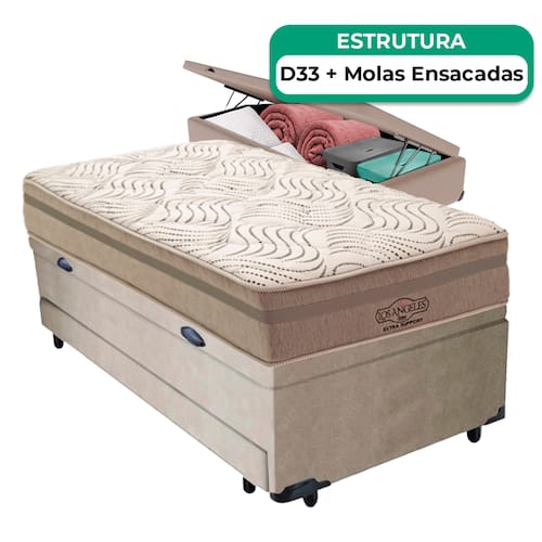 A tecnologia que a sua casa merece está na V-Store! O Conjunto Colchão Los Angeles + Bicama com Cama Auxiliar e Baú da V-Store é a escolha perfeita para quem busca conforto, organização e funcionalidade. O colchão Los Angeles, com molas ensacadas e conforto macio, garante noites de sono tranquilas, enquanto suas proteções contra ácaros, fungos e alergias promovem saúde e bem-estar. A bicama oferece uma cama auxiliar com espuma D28, ideal para visitas, e um baú espaçoso para armazenar travesseiros, roupas de cama ou outros itens, otimizando o espaço do quarto com praticidade e estilo. Adquira já e transforme seu dormitório com conforto e organização!Característica Do Colchão: Modelo: Los AngelesMarca: V-StoreTamanho: SolteiroDimensões: 78x28x188 (Largura x Altura x Comprimento)Conforto: MédioSistema: Molas EnsacadasPillow: Não se aplicaPeso Máximo recomendado: 150 kg (Por pessoa)Proteções: Antiácaro, antialérgico, antifungo, antimofoGarantia: 12 Meses (Espuma) / 10 anos ( Conjunto de Molas Ensacadas)Característica Da Base: Marca: V-StoreModelo: Bicama com BaúTamanho: SolteiroDimensões: 78x44x188 (Largura x Altura x Comprimento)Estrutura: MadeiraPeso máximo recomendado: 150 kg (Por Pessoa)Altura do Box: 38 cmAltura dos Pés: 6 cmAltura total: 44 cmMedida Cama Auxiliar: 78x44x188 (LxAxC) cmGarantia: 12 Meses (Estrutura e Estofamento) / 3 Meses (Tecido)Selo Ecologicamente CorretoAtenção:- Antes de finalizar sua compra, recomendamos que verifique se as dimensões do produto são adequadas para serem transportadas pelos elevadores, portas, escadas e corredores de sua residência. Ressaltamos que não nos responsabilizamos pelo transporte do produto por meios específicos, como escadas, guinchos ou içamentos.- É possível que hajam leves variações de cor de acordo com o dispositivo que está sendo utilizado como smartphones, computadores, monitores e outros.