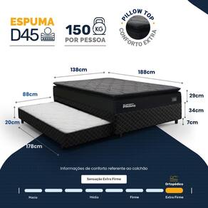 Espuma D45, Espuma D28, EPS Poliestireno Expansível, Madeira tratada, Poliéster.Procurando um colchão que ofereça suporte extra firme e máxima durabilidade? Nosso modelo de Espuma D45 com Pillow Top foi desenvolvido para quem valoriza conforto e estabilidade. A densidade D45 proporciona firmeza superior, enquanto a camada extra de Pillow Top garante alívio nos pontos de pressão.