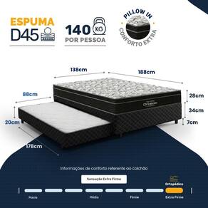 Espuma D45, Espuma D28, Malha, Poliéster, Madeira tratada, EPS Poliestireno ExpansívelProcurando um colchão que ofereça tanto conforto quanto suporte? Nosso colchão com espuma D45 e pillow in é a escolha ideal para quem busca um descanso firme. Ele suporta até 140 kg por pessoa, garantindo uma base sólida e confortável para uma excelente noite de sono.