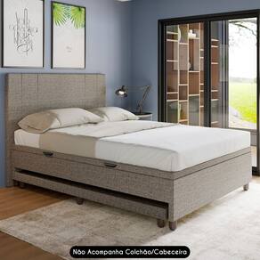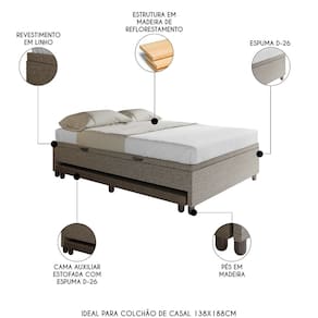 Características do Produto Material da estrutura: Madeira Reflorestada. Densidade da Espuma: Espuma D26. Peso Suportado: 300 Kg. Revestimento: Linho. Possui Pés: Sim. Material dos Pés: Madeira. Altura dos Pés: 6 cm. Possui Rodízios: Não. É Bipartido: Não. Acompanha Colchão: Não. Acompanha Cabeceira: Não. Diferenciais: - Design moderno. - Cama auxiliar estofada com espuma D-26. - Baú com puxadores e pistão a gás. - Pés de madeira. Sistema de Montagem: Parafusos. Manual de Montagem: Não. Complexidade da Montagem: Baixa. Conteúdo da Embalagem: 1 Base de cama com auxiliar. Volumes: 1 Volume. Garantia do Fabricante: 90 dias contra defeitos de fabricação. Montagem: Recomendamos que seja feita por um profissional. Recomendação de limpeza: Utilize pano levemente úmido.