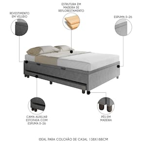 Características do Produto Material da estrutura: Madeira Reflorestada. Densidade da Espuma: Espuma D26. Peso Suportado: 300 Kg. Revestimento: Veludo. Possui Pés: Sim. Material dos Pés: Madeira. Altura dos Pés: 6 cm. Possui Rodízios: Não. É Bipartido: Não. Acompanha Colchão: Não. Acompanha Cabeceira: Não. Diferenciais: - Design moderno. - Cama auxiliar estofada com espuma D-26. - Baú com puxadores e pistão a gás. - Pés de madeira. Sistema de Montagem: Parafusos. Manual de Montagem: Não. Complexidade da Montagem: Baixa. Conteúdo da Embalagem: 1 Base de cama com auxiliar. Volumes: 1 Volume. Garantia do Fabricante: 90 dias contra defeitos de fabricação. Montagem: Recomendamos que seja feita por um profissional. Recomendação de limpeza: Utilize pano levemente úmido.