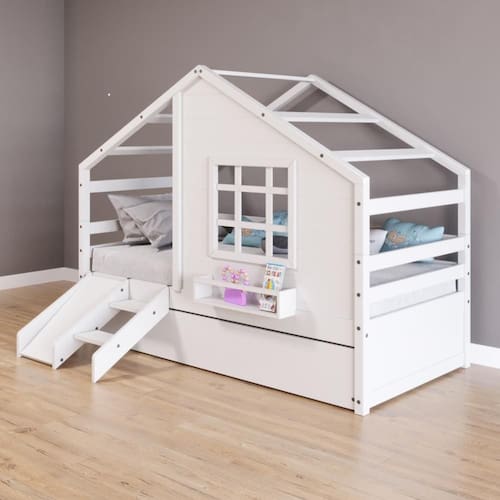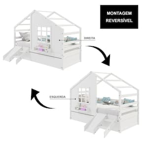 Diferenciais: Auxiliar com 4 rodízios, Casinha com fechamento em MDF, Janela e Prateleira para Livros e Decoração, Kit Escada/ Escorregador, Montagem Reversível (Lado Direito ou Lado Esquerdo)
