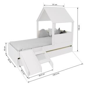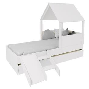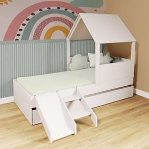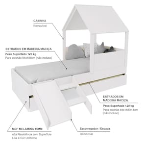 Diferenciais: Auxiliar com 4 rodízios, MDF Melamina 15mm, Estrados em Madeira Maciça, Casinha com Telhado, Kit escada/ escorregador.