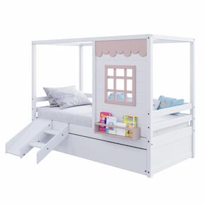 Diferenciais: Auxiliar com 4 rodízios, Kit Escada/ Escorregador, Casinha com fechamento em MDF, Janela e Prateleira para Livros e Decoração, Montagem Reversível (Lado Direito ou Lado Esquerdo)